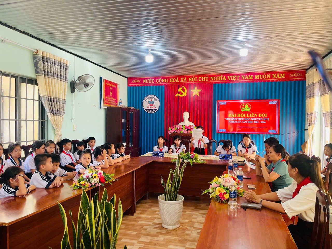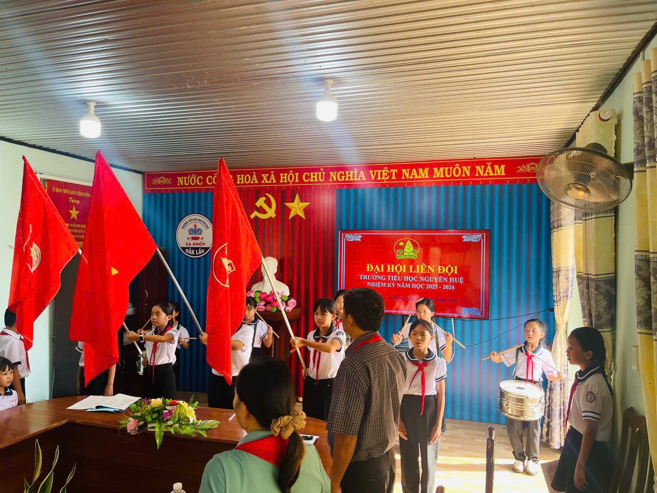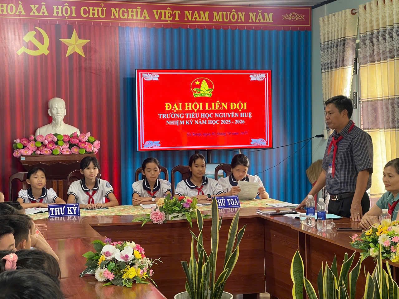 Chiều ngày 02/10/2025 Liên đội Trường tiểu học Nguyễn Huệ đã long trọng tổ chức Đại hội Liên đội nhiệm kì 2025-2026. Về dự với Đại hội có thầy Bùi Văn Thành Bí thư chi bộ – HT nhà trường, các thầy cô cùng các anh chị phụ trách chi đội và gần 50 bạn đội viên nhi đồng xuất sắc về tham dự.