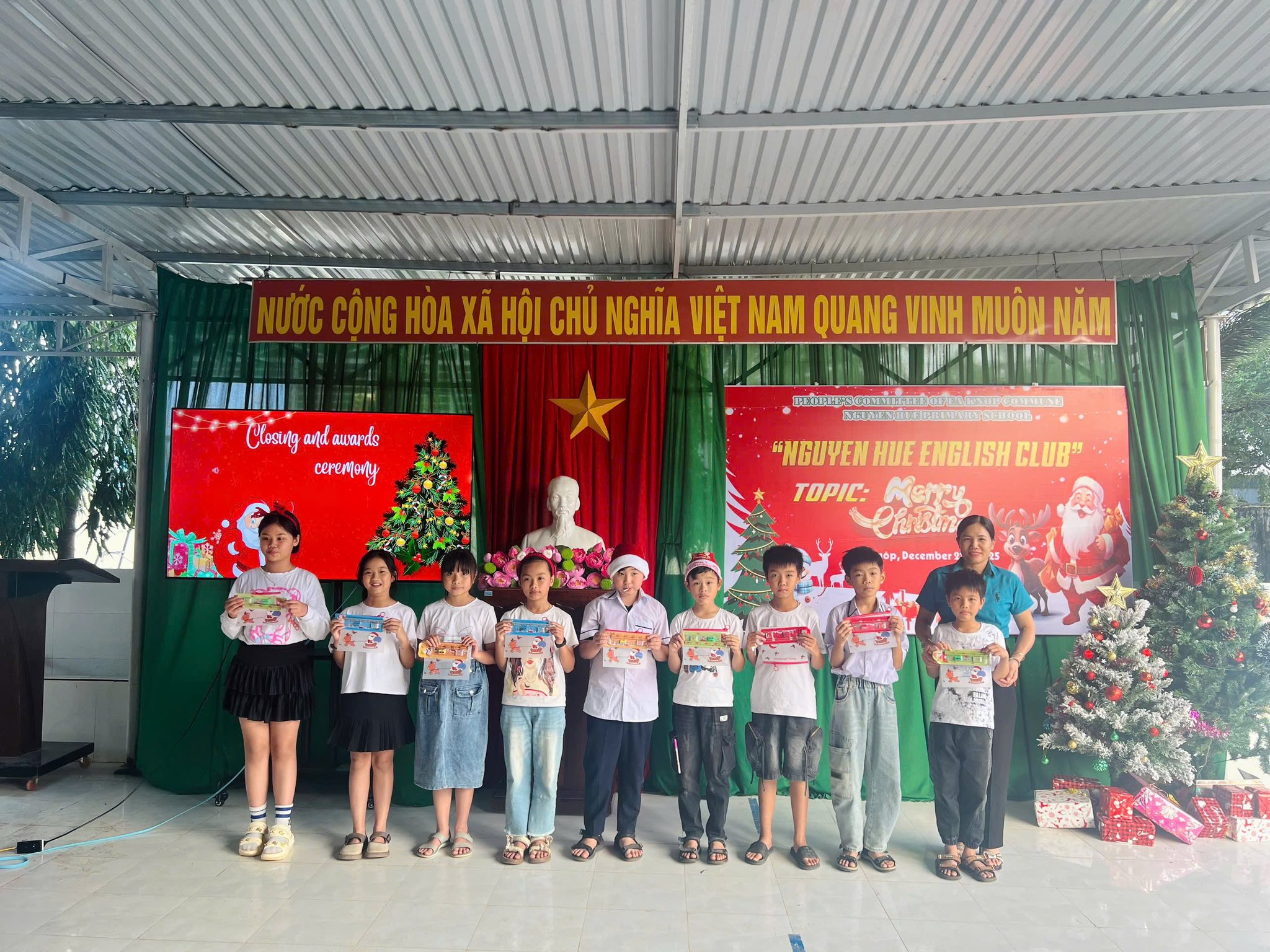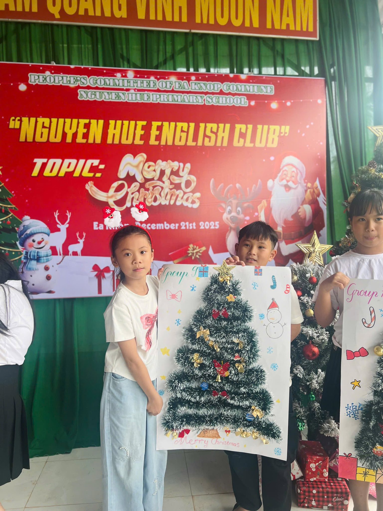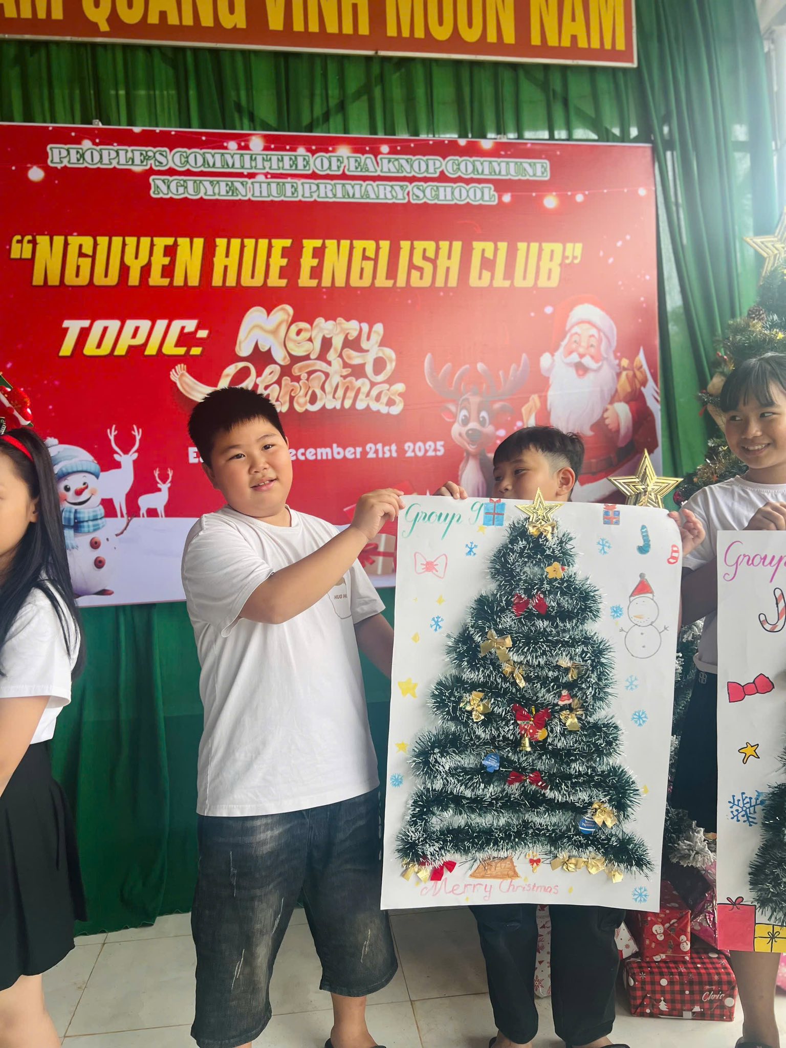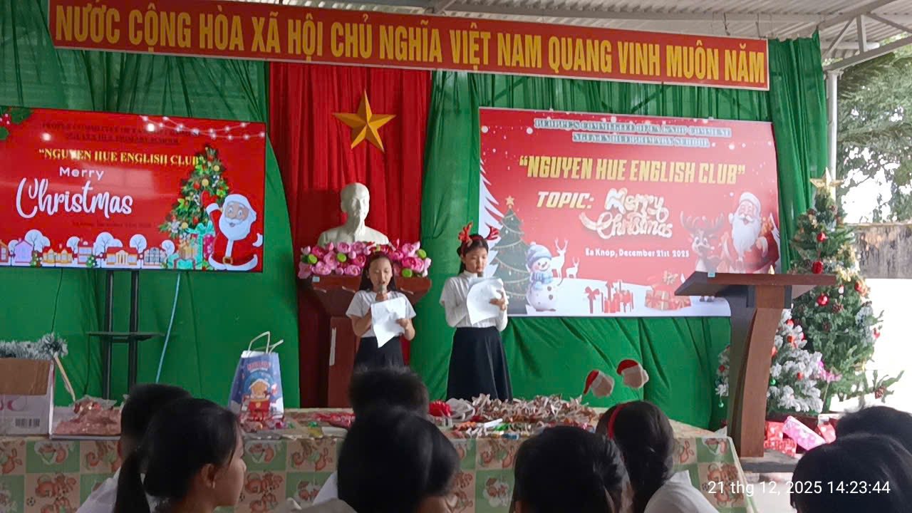 Trong không khí rộn ràng của những ngày cuối năm 2025, các bạn nhỏ khối 4 và 5 của Trường tiểu học Nguyễn Huệ đã có buổi sinh hoạt Câu lạc bộ tiếng Anh vô cùng sôi động với chủ đề “Lễ Giáng Sinh”. Các bạn đã được tham gia vào các trò chơi sôi động, được chia thành những nhóm nhỏ đầy hào hứng để tham gia thử thách sáng tạo: thi cắt dán ruy băng thành hình cây thông Noel. Bằng sự khéo léo và tinh thần đồng đội, những dải ruy băng xanh, đỏ rực rỡ đã được các em biến hóa thành những cây thông độc đáo. Hoạt động không chỉ giúp các em trau dồi vốn từ vựng về chủ đề lễ hội mà còn tạo điều kiện để các bạn rèn luyện kỹ năng làm việc nhóm và tự tin giao tiếp bằng tiếng Anh trong một không gian tràn đầy niềm vui.