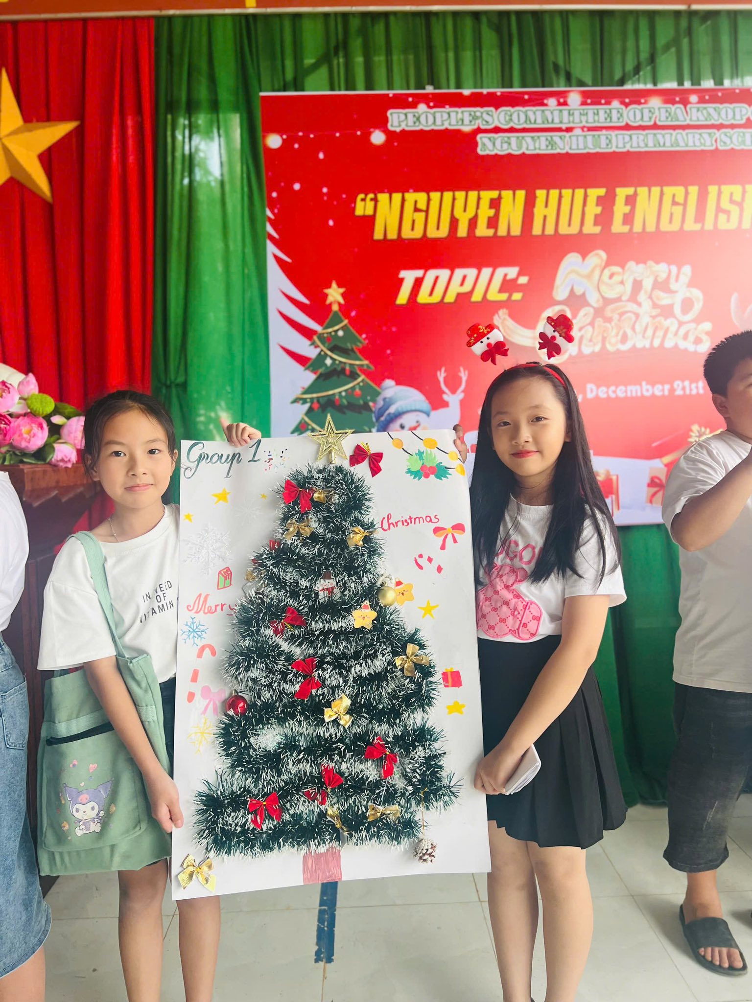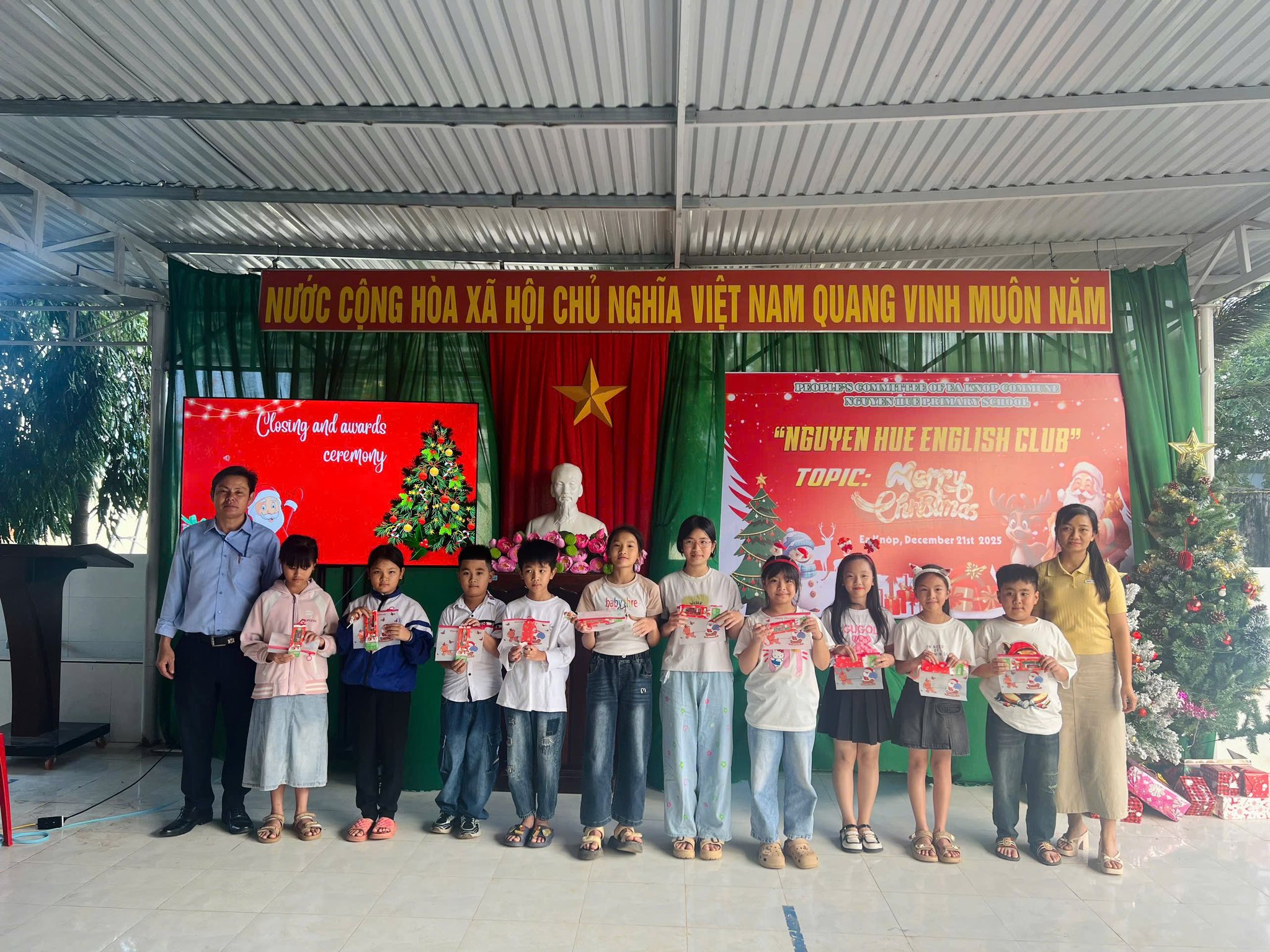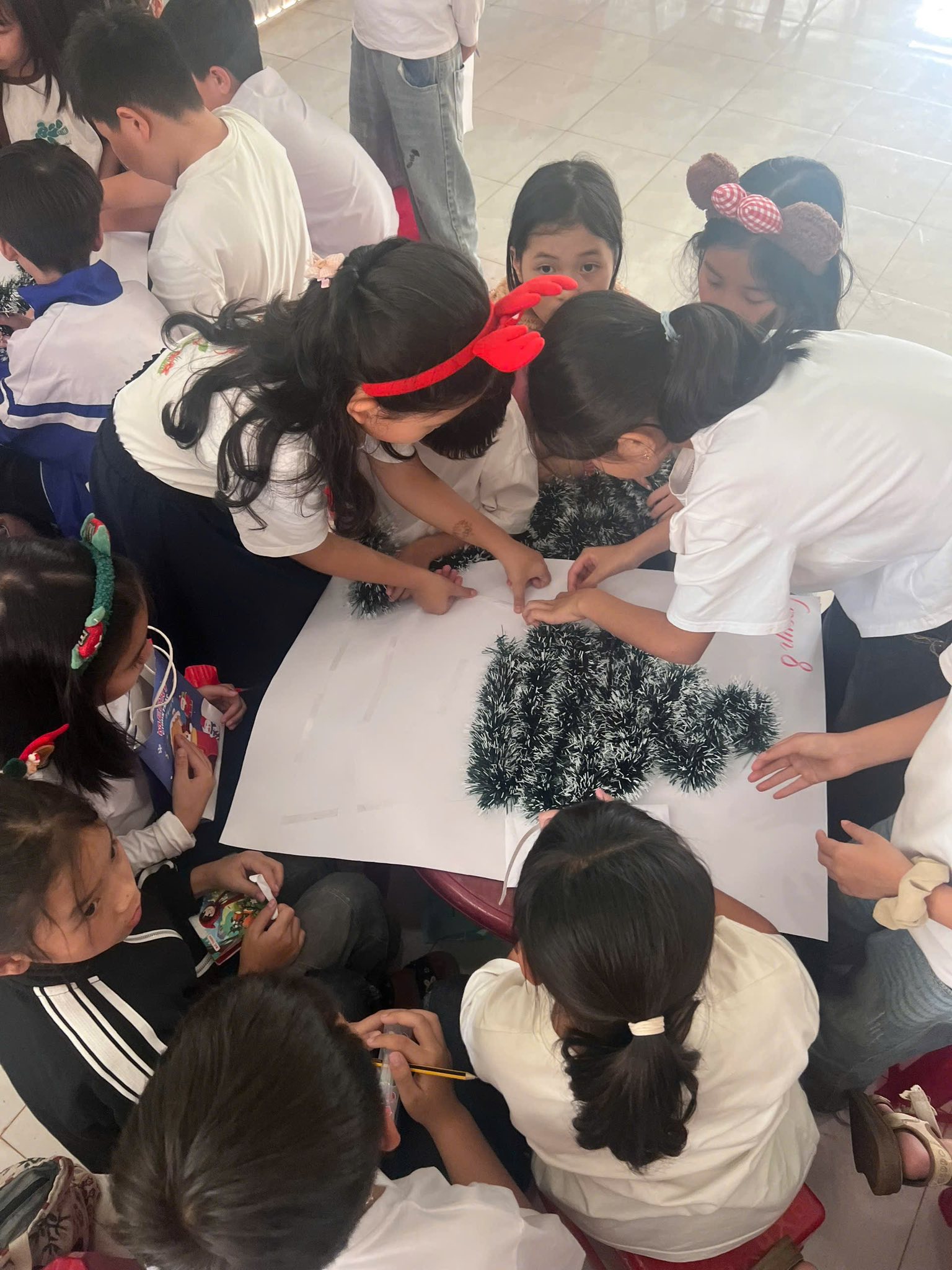 Trong không khí rộn ràng của những ngày cuối năm 2025, các bạn nhỏ khối 4 và 5 của Trường tiểu học Nguyễn Huệ đã có buổi sinh hoạt Câu lạc bộ tiếng Anh vô cùng sôi động với chủ đề “Lễ Giáng Sinh”. Các bạn đã được tham gia vào các trò chơi sôi động, được chia thành những nhóm nhỏ đầy hào hứng để tham gia thử thách sáng tạo: thi cắt dán ruy băng thành hình cây thông Noel. Bằng sự khéo léo và tinh thần đồng đội, những dải ruy băng xanh, đỏ rực rỡ đã được các em biến hóa thành những cây thông độc đáo. Hoạt động không chỉ giúp các em trau dồi vốn từ vựng về chủ đề lễ hội mà còn tạo điều kiện để các bạn rèn luyện kỹ năng làm việc nhóm và tự tin giao tiếp bằng tiếng Anh trong một không gian tràn đầy niềm vui.